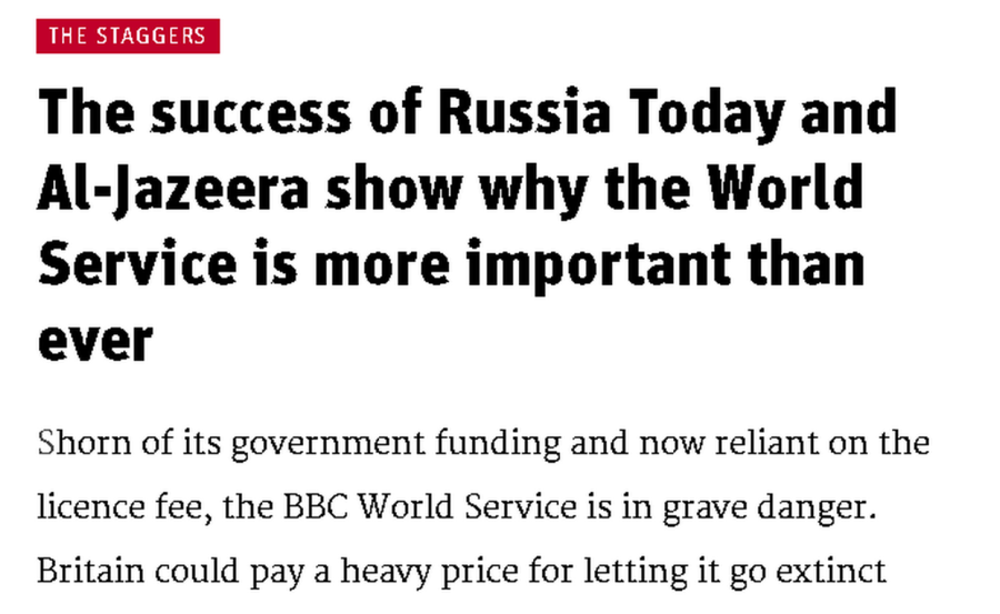 Had Newsweek done proper due diligence, they would have noticed that, as stated many times before, RT received 17 billion rubles, or approximately 275 million dollars in funding for the year 2016. Then they went ahead and misrepresented the circumstance of BBC World Service’s funding, implying that it was cut off. That’s a far cry from the reality of BBC’s financing: the BBC World Service (which focuses primarily on radio and digital platforms, rather than round-the-clock TV programming, like RT) continues to receive annual subsidy of £245 million, sourced from the mandatory license fee, as well as supplementary £289 million over five years from the country’s security and defense budget. Furthermore, these figures do not even include the budget for BBC World News – UK's global television service. As such, BBC’s financial disadvantage vis a vis RT when it comes to global news broadcasting is pure fiction. At least Newsweek elaborated on the situation, after being contacted by RT….Props!
